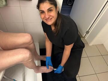 Mijn eerste cliënt van de dag wacht me op met een heerlijk kopje koffie. Na een praatje help ik mevrouw bij het douchen. Ik was haar haren en blaas het droog. Nadien knip ik haar vinger- en teennagels zodat ze fris aan de dag kan beginnen.