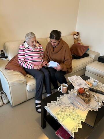 Deze dame ontving een aantal officiële brieven die ze niet goed begrijpt. Ik help haar bij haar administratie en doe nog enkele telefoontjes om afspraken vast te leggen, onder andere bij de dokter en de kinesist. Daarna drinken we samen koffie en neem ik de tijd om naar haar verhalen te luisteren.